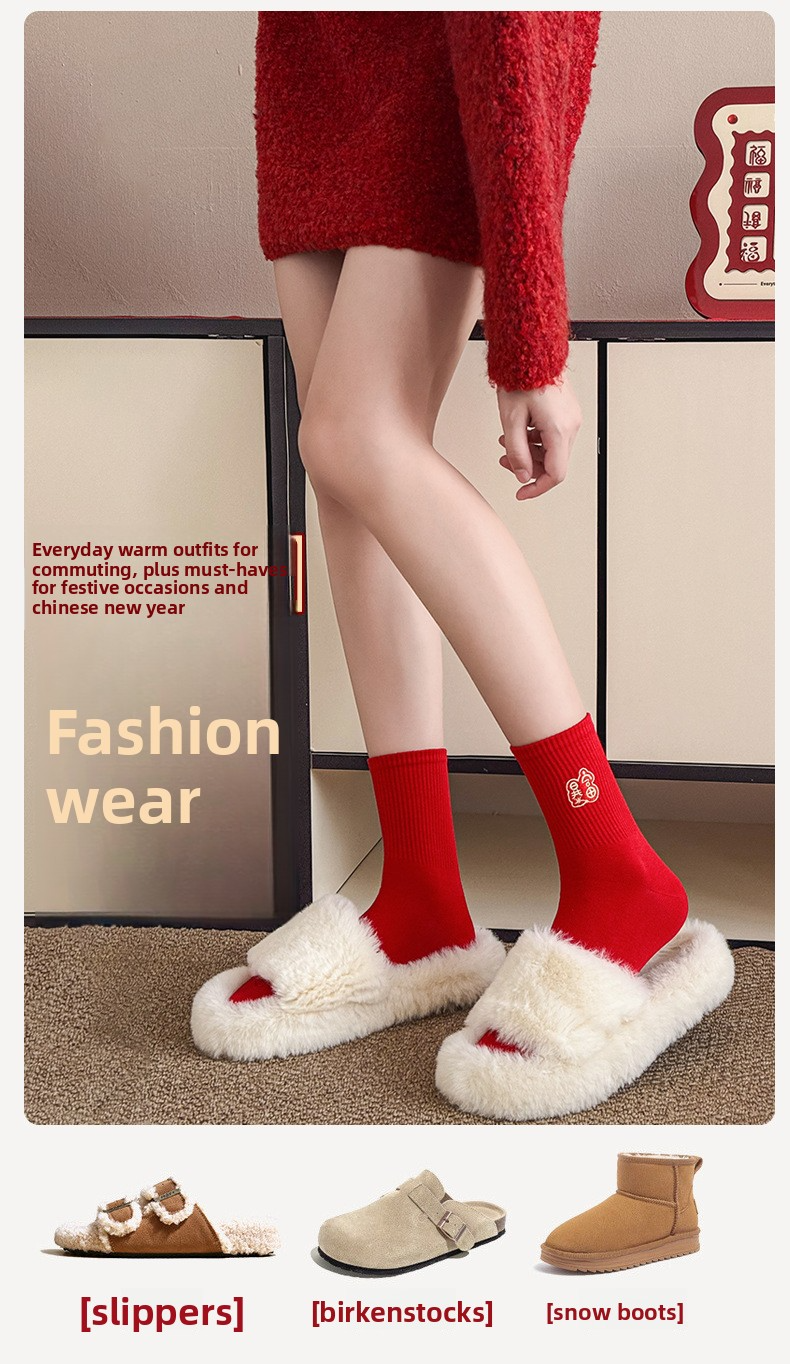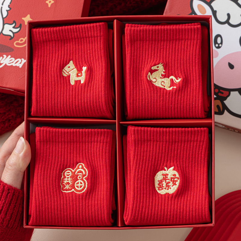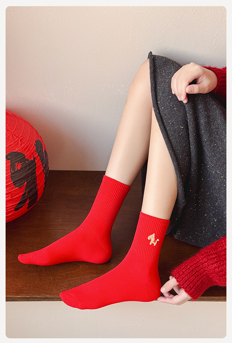 【Buy one, get three】Year of the Horse Red Socks Zodiac Year Embroidered Cartoon New Year Gift Box Socks Unisex Festive Mid-Calf Socks