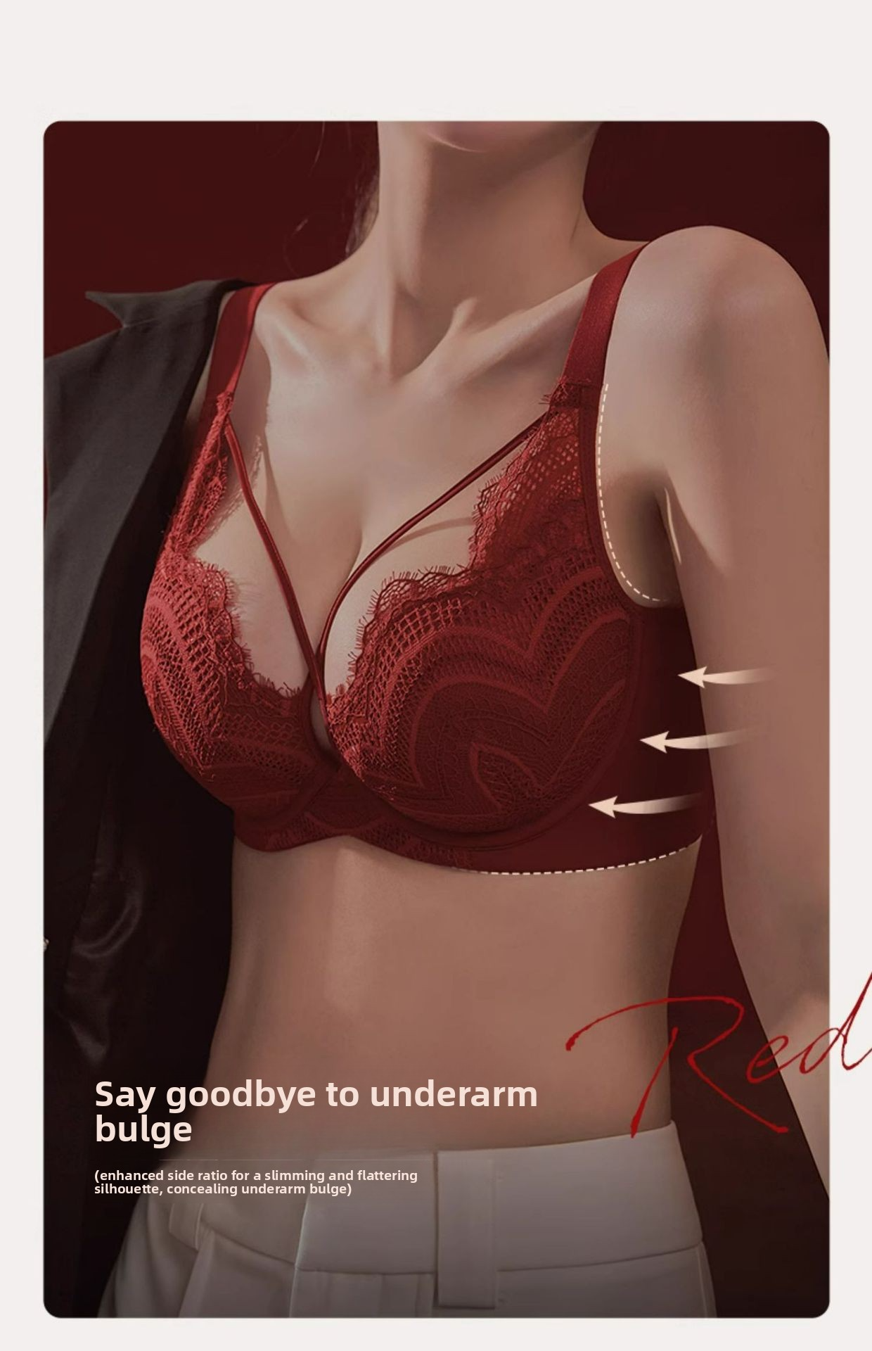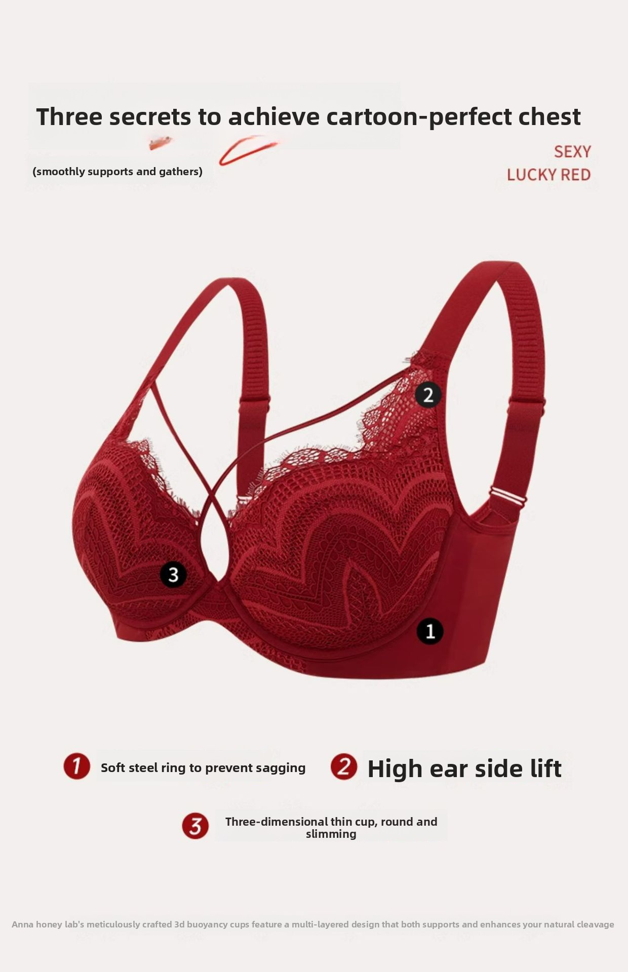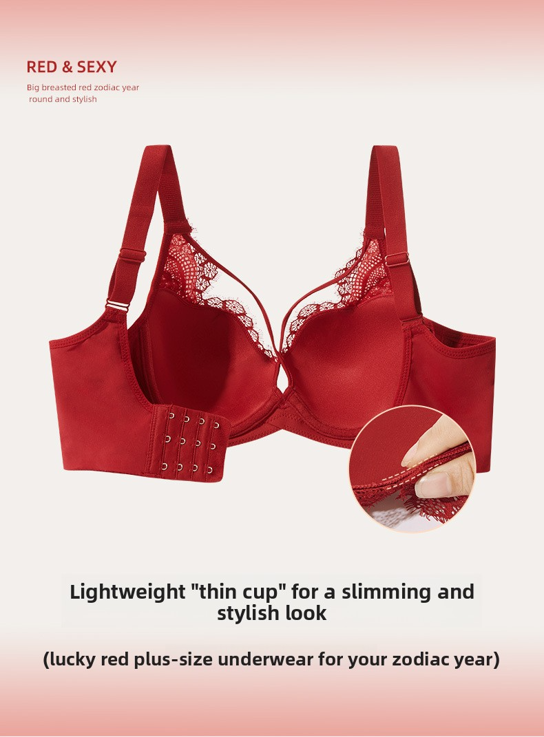 Red Zodiac Year Large Bust Minimizing Anti-Sagging Lace Bra Adjustable Push-Up French Style